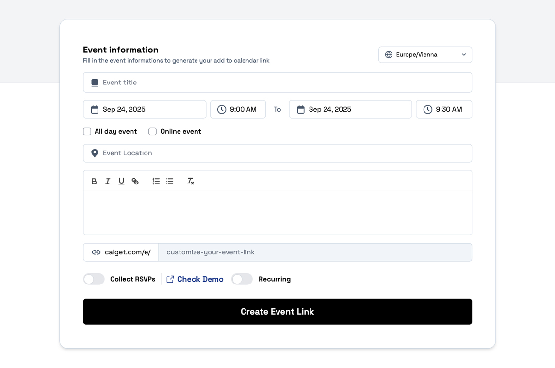 "Easily generate “Add to Calendar” links with CalGet, compatible with Google Calendar, Outlook, Yahoo, Office 365, Apple Calendar, and more.