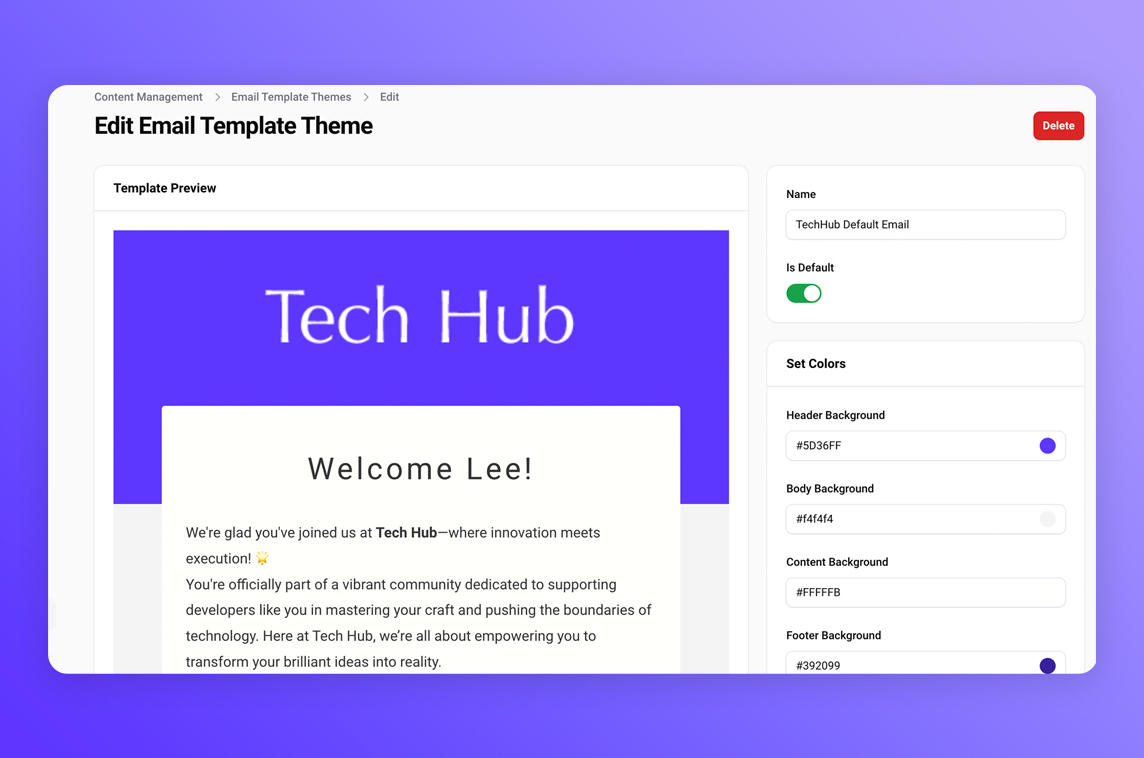 It supports replacable model attribute tokens or config values (e.g. ##user.name##), multi-lingual templates, a theme editor and more.