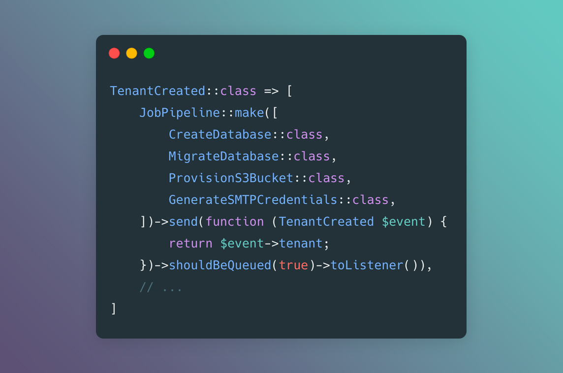 JobPipelineis a simple, yet extremely powerful class that lets you convert any (series of) jobs into event listeners.You may use a job pipeline like any other listener, so you can register it in the
