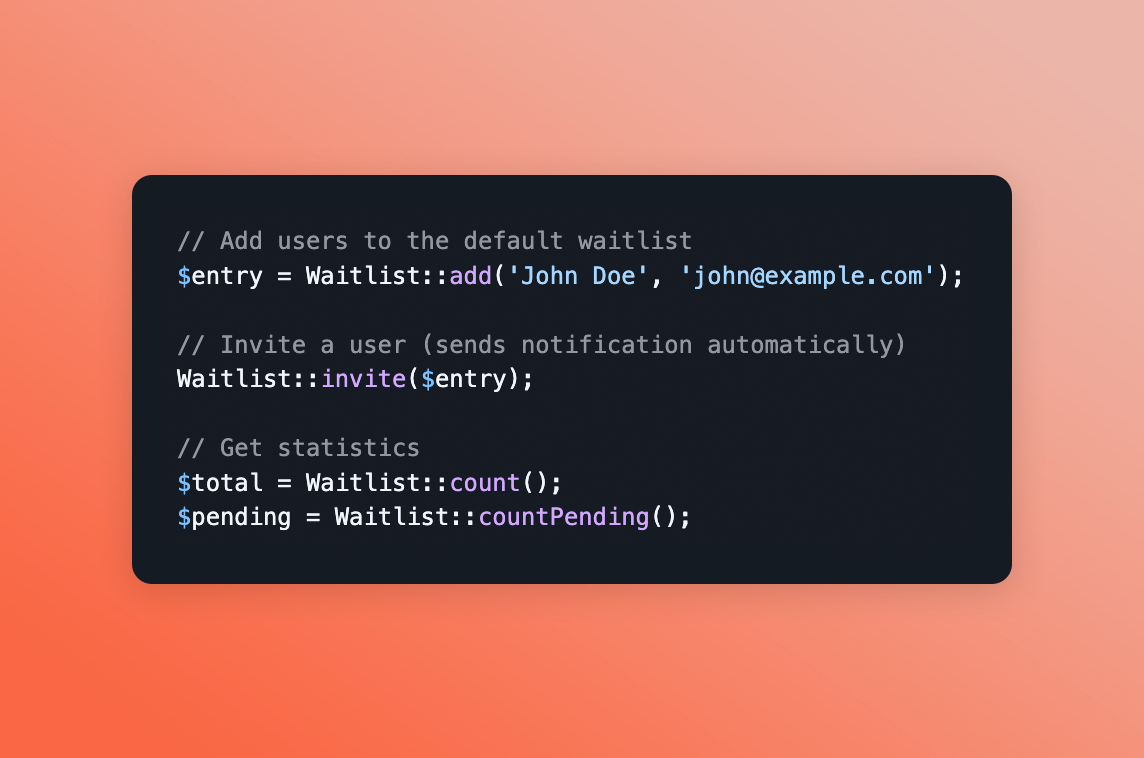 "Laravel Waitlist is a simple and flexible waitlist package for Laravel applications. Manage multiple waitlists with ease - perfect for beta programs, product launches, feature access, and more.