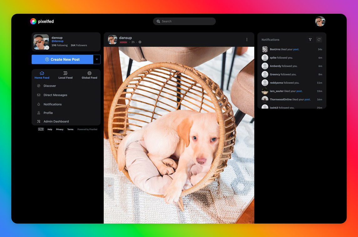 "Pixelfed is an open-source, decentralized photo and video sharing platform built with Laravel, Vue.js and Bootstrap. You can run it on your own server or join another one."