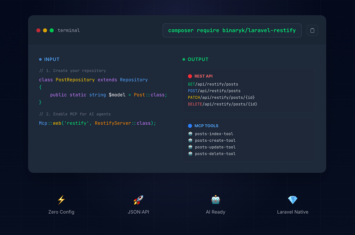 "Laravel Restify turns your Eloquent models into both JSON:API endpoints and MCP servers automatically.