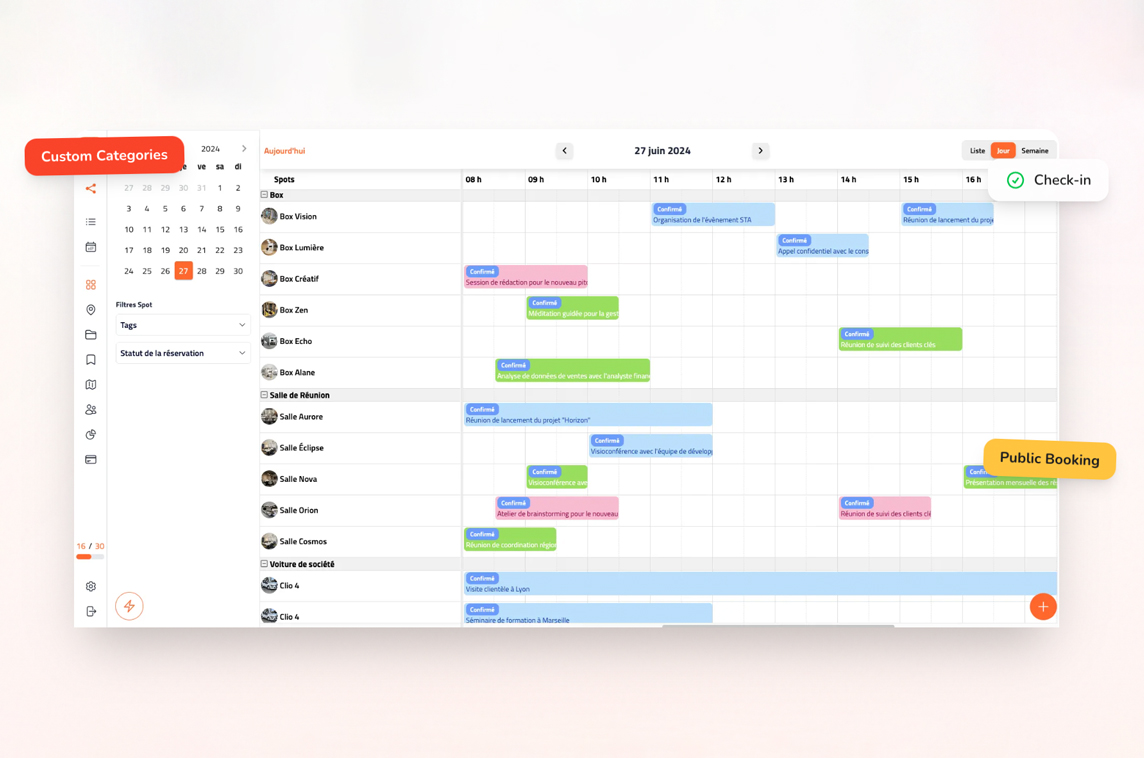 Features include real-time availability search, recurring bookings, multi-level approval workflows, analytics dashboards, and public booking forms for coworking spaces. The platform serves organizations across 4 languages (EN, FR, ES, PT) and is actively maintained with regular feature updates.
