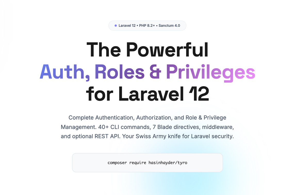 "Tyro is a powerful authentication, authorization, and role & privilege management solution for Laravel 12. Think of it as a swiss army knife that handles everything from user authentication and role-based access control to user suspension workflows—whether you're building an API, a traditional web application, or both.